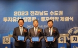 정치 전향윤 기자2023. 06.28[뉴스맘]전라남도는 28일 웨스틴조선서울호텔에서 첨단·전략산업 투자유치를 위한 ‘수도권 투자유치 설명회’를 열고 ㈜한화 글로벌부문 등 5개 기업과 2조 5천억 원 규모 투자협약을 했다. 이날 설명회에는 김영록 전남도지사, 정기명 여수시장, 정인화 광양시장, 강종만 영광군수, 신우철 완도군수, 김병윤 베스타스 부사장, 하운식 GE리뉴어블에너지 사장, 임효성 ㈜효성 상무, 노형섭 일진전기 전무, 박상훈 HD현대일렉트릭 전무, 이성백 재경광주전남향우회 수석 부회장, 수도권 소재 기업과 협회 대표 150여 명이 참석했다. 행사는 투자협약…