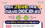 광양 전향윤 기자2023. 06.27[뉴스맘]광양시는 고향사랑기부제 시행으로 모금된 기부금을 활용하여 기부자가 공감하고 지역주민이 체감하는 기금사업을 발굴하기 위해 6월 26일부터 7월 26일까지 고향사랑기부제 기금사업 아이디어 공모전을 진행한다고 밝혔다. 대한민국 국민이면 누구나 응모 가능하며, 공모 분야는 △사회적 취약계층의 지원 및 청소년의 육성 보호 △지역주민의 문화ㆍ예술ㆍ보건 등의 증진 △시민참여, 자원봉사 등 지역공동체 활성화 지원 △그 밖에 주민의 복리증진에 필요한 사업이다. 공모전은 방문, 우편, 이메일을 통해 참여할 수 있으며, 공모 관련 자세한 …