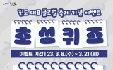 사회 전향윤 기자2023. 03.09[뉴스맘]진도군이 ‘진도 신비의 바닷길 축제’ SNS 초성 퀴즈 이벤트를 실시한다. 초성 퀴즈는 현대판 모세의 기적으로 불리며, K-명예문화관광축제로 선정되어 오는 4월 20일부터 진도군에서 개최되는 축제의 이름을 맞추면 된다. 이벤트는 오는 21일(화)까지 진행되며, 진도군 유트뷰와 페이스북, 인스타그램 등 SNS를 구독·캡처하고 네이버폼에 초성 퀴즈 정답과 응모 정보를 입력하면 된다. 참여자 중 100명을 무작위로 추첨해 모바일 커피 쿠폰을 제공한다. 당첨자 발표는 오는 24일(금) 진도군 인스타그램에서 실시하며, 경품은 …