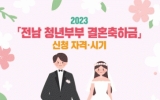전남 전향윤 기자2023. 03.08[뉴스맘]전라남도는 청년부부 결혼축하금 규모를 100억 원으로 확대하고 지원 조건도 완화해 지역 유입과 정착을 촉진한다고 밝혔다. 청년부부 결혼축하금은 전남도가 2021년부터 전국 광역시.도 중 유일하게 추진하는 사업이다. 도내 거주 조건을 1년 이상에서 6개월 이상으로 단축하고 사업비도 지난해 대비 12억 원 증액해 부부 5천 쌍을 대상으로 각 200만 원을 지원한다. 2022년 1월 1일 이후 혼인신고를 한 남녀 모두 만 49세 이하 청년부부로 최소 한 사람은 초혼이어야 신청할 수 있다. 신청 자격을 갖춘 청년부부는 혼인신고…