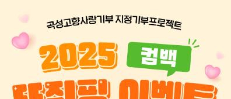 곡성곡성군, 고향사랑기부제 “컴백 또줘핑~~” 이벤트 진행[뉴스맘]곡성군이 11월 1일부터 12월 31일까지 두 달간 곡성군 고향사랑기부제 “컴백 또줘핑~~”이벤트를 진행한다. “컴백 또줘핑” 이벤트는 곡성군이 지역 농·축협 및 농협중앙회 곡성군지부와 협력해 고향사랑기부제를 통해 지역 농산물 홍보와 지역문제 해결에 기여하기 위해 마련됐다. 곡성군 고향사랑기부 공식 인스타그램에 소개된 소액 기부자들의 따뜻한 사연과 지역문제에 대한 공감에 보답하고, 앞으로 기부에 참여할 분들에게도 감사의 마음을 전하고자 하는 취지를 담고 있다. 두 달 동안 10만 원 이상 기부자에 대해 매달 500명을 무작위 추첨해 1만 원 …