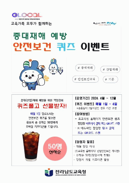 이벤트는 4월부터 12월까지 운영하며, 매월 1 부터 4일 사이 응모할 수 있다. 퀴즈 내용은 중대재해처벌법 주요 내용과 전남교육청 의무이행 사항 등 중대(산업)재해 예방을 위한 사항들이다.