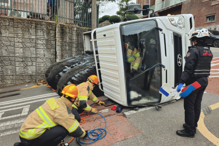 여수소방서 119구조대와 구급대원이 현장에 도착한바, 구조대상자 A씨는 화물차에 지게차가 물품을 싣는 과정에서 차량이 전도되어 발이 우측 조수석 문틈에 끼어 고통을 호소하고 있는 상황이었다.