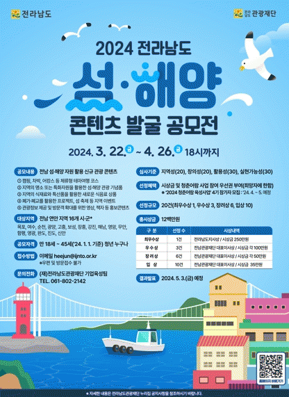 이석호 전남도 관광개발과장은 “이번 공모전은 전남의 아름다운 자연경관과 풍부한 문화자원을 기반으로 한 섬·해양 관광산업 활성화를 촉진하고 지역 경제에 활력을 불어넣기 위한 것”이라며 “참가자들의 다양하고 창의적인 아이디어가 전남 관광 발전에 큰 도움이 될 것으로 기대한다”고 말했다.