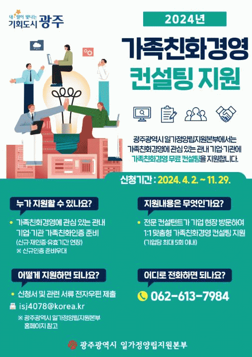 참여를 원하는 기업과 기관은 광주시 누리집 고시·공고 또는 광주일가정양립지원본부 누리집 새소식에서 신청서를 내려받아 작성한 후 전자우편으로 신청하면 된다.