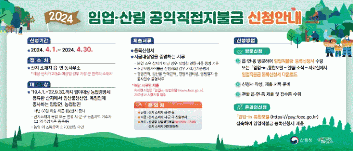 이와 함께, 산림청은 임업직불금 신청과 관련해 연중 전화상담센터를 운영 중이다.