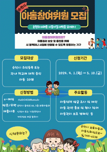 모집대상은 순천시에 주민등록이 되어 있거나 관내 학교에 다니고 있는 18세 미만의 아동이다. 참여를 희망하는 아동은 5월 10일까지 보육아동과로 신청하면 된다. 더 자세한 모집안내 및 신청방법은 순천시 누리집을 참고하면 된다.