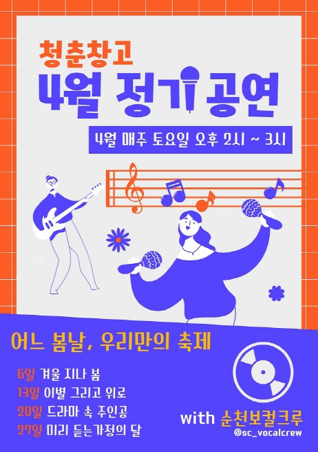 이번 공연은 관내 청년 예술공연 단체인 ‘순천보컬크루’와 함께한다. 첫 번째 주에는 따뜻한 봄날을 맞이해 ‘봄’을 주제로 공연을 진행하며 둘째 주에는 ‘이별’, 셋째 주에는 ‘OST’, 마지막 넷째 주에는 ‘가족’을 주제로 공연을 펼친다.