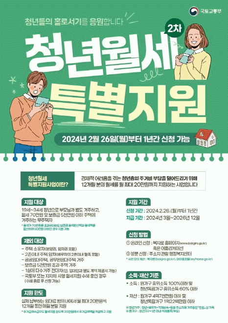 앞서 시행한 1차 청년월세 한시 특별지원 혜택을 받은 청년도 월세 12회를 다 받고 지원이 종료된 경우라면 신규신청이 가능하다.