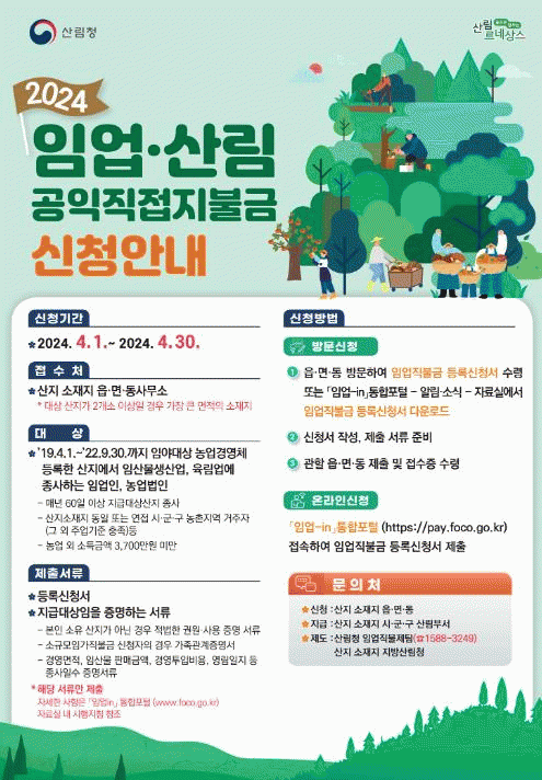 직불금 신청 관련 문의 사항은 나주시 누리집 공고문 또는 공원녹지과, 읍·면·동, 산림청 전화상담센터로 하면 된다.