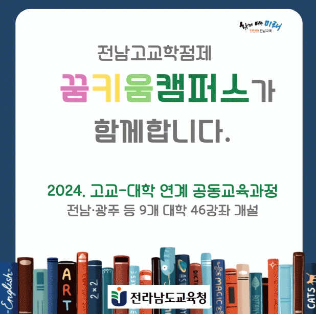 도교육청은 학생 선택과목 수요 조사 결과와 지난해 운영 경험을 바탕으로 전남·광주 지역 등 7개 대학(광주교대, 목포대, 순천대, 전남대, 조선대, 한국에너지공과대, 한국외대)과 지역 기관(지리산생태탐방원, 국립청소년우주센터)의 참여 아래 학생 선호도가 높은 46강좌를 개설해 4기로 나눠 운영키로 했다. 1기는 5강좌에 32교, 70명의 고등학생이 참여해 4월부터 수업을 시작한다.