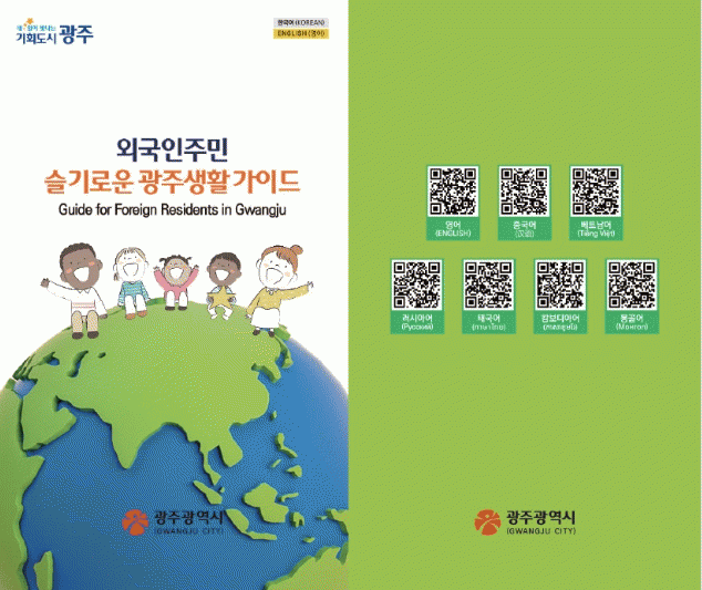 광주광역시는 서투른 한국어와 정보 부족으로 초기 지역정착에 어려움을 겪고 있는 외국인주민의 일상생활에 도움을 주기 위해 ‘외국인주민 슬기로운 광주생활 가이드’를 제작·배포하고, ‘광주가이드’ 웹사이트를 운영한다.