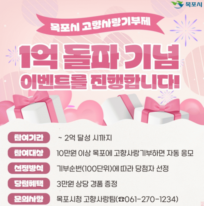 고향사랑e음 누리집이나 가까운 농협을 방문해 목포시에 10만원 이상 고향사랑기부를 하면 이벤트에 자동 응모되며, 이벤트 진행 시점부터 기부 순번이 100번째가 될 때마다 개별 통지한다.