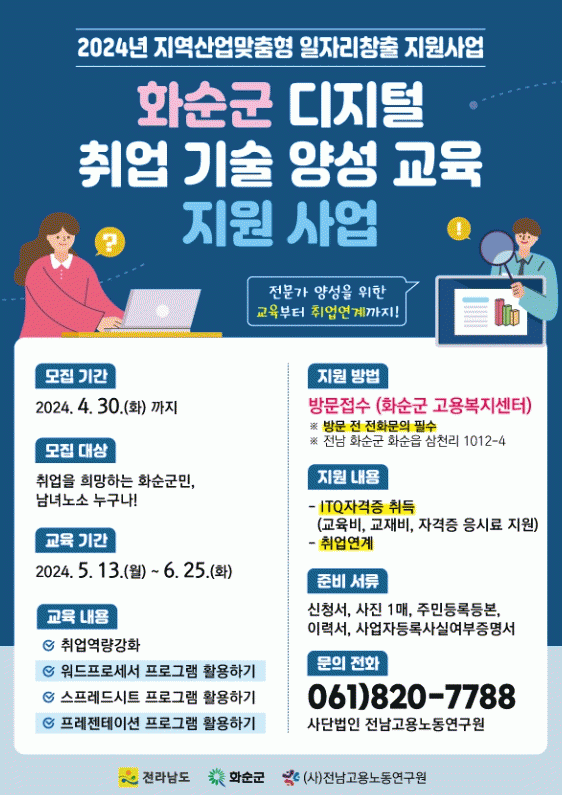 ‘화순군 디지털 취업기술 양성 교육 지원사업’은 '2024년 전라남도 지역산업 맞춤형 일자리 창출 지원사업의 일환으로 화순군이 주관하며, (사)전남고용노동연구원이 사업수행을 담당한다.