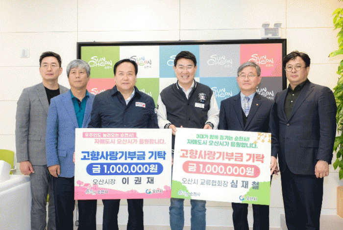 이번 기부는 자매도시인 순천시와 오산시의 상생 발전과 지속적인 교류 관계를 도모하고 고향사랑기부제의 활성화를 위해 이권재 오산시장과 심재철 교류협회장은 각 100만 원씩 순천시에 기부했다.