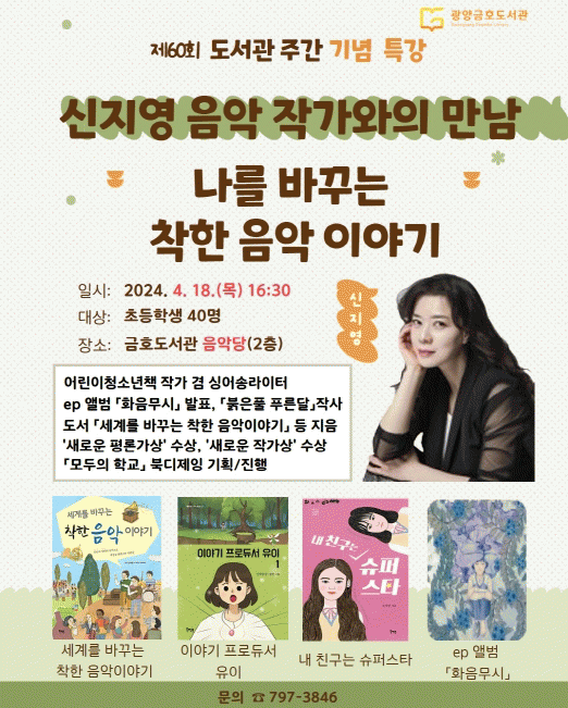 참가 신청은 4월 1일부터 시립도서관 누리집(lib.gwangyang.go.kr)을 통하거나 금호도서관에 전화로 신청 가능하며, 기타 궁금한 사항은 금호도서관으로 문의하면 자세히 안내받을 수 있다.