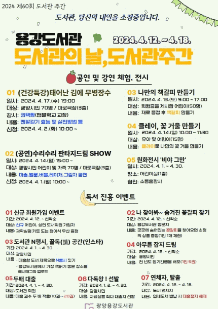 행사에 대한 자세한 사항은 광양시립도서관 누리집을 방문하거나 각 도서관에 문의하면 된다.