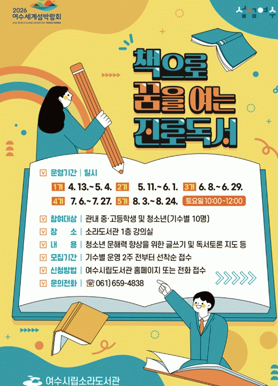 ‘책으로 꿈을 여는 진로독서’는 청소년 문해력 향상을 위해 글쓰기 및 독서토론을 지도하는 프로그램으로 1기당 정원 10명, 총 5기 20회 운영될 계획이다.