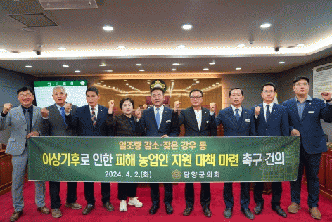 이에 군의회는 건의문을 통해 ‘농업재해 인정으로 진행될 농작물 피해조사를 적극 실시’하고, ‘이상기후로 인한 재해 인정범위 대폭 확대, ‘'농업재해대책법','농업재해대책법 시행령' 전면 개정’ 및 ‘농작물재해보험의 범위와 정부의 보험료 지원 확대’를 강력하게 촉구했다.