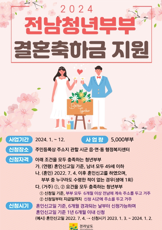 거주요건은 혼인신고 이후 부부 모두 전라남도에 6개월 이상 거주(지급 기한 내 타 시도 전출자 제외)하며 부부 중 1명(신청자) 이상은 광양시에 주소지를 둔 청년 부부이다.