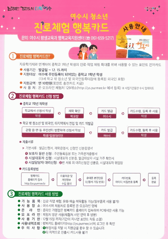 지원 대상은 여수시에 거주하는 중학교 1학년 재학생과 13세 학교 밖 청소년이다.