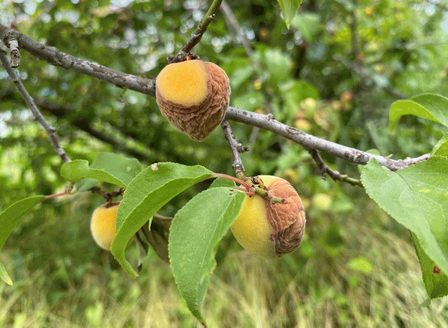 초기 과실에 나타나는 증상은 거의 없으나 수확 직전 표면 일부가 갈색으로 함몰되면서 낙과하는 경우가 많다.
