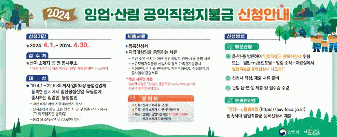 장성군 관계자는 “임업직불금 신청에 필요한 서류와 자격요건 등을 미리 확인해 꼭 기한 내 접수하기 바란다”고 당부했다.