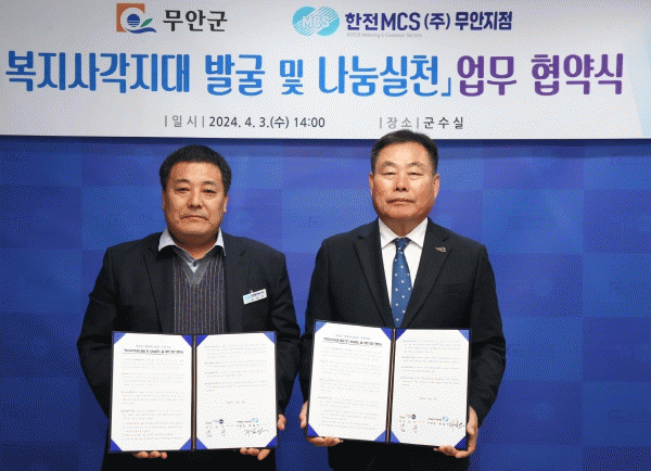 김산 군수는 “한전MCS(주) 무안지점과 업무협약 체결을 통해 복지사각지대 해소에 한 발 더 앞서가게 될 것을 기대하며, 위기가구에 맞춤형 복지서비스가 신속하게 지원될 수 있도록 적극 지원하겠다”고 밝혔다.