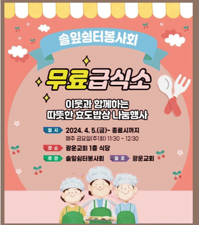 독거노인, 장애인 등 결식이 우려되는 취약계층 누구나 이용할 수 있는 이번 무료 급식소의 운영 기간은 이달 5일부터 혹서기(8월)와 혹한기(12월)를 제외하고 연중 매주 금요일 오전 11시 30분부터 오후 1시까지로 해당 시간에 일 120인분 이상의 점심 식사를 무료로 제공할 계획이다.