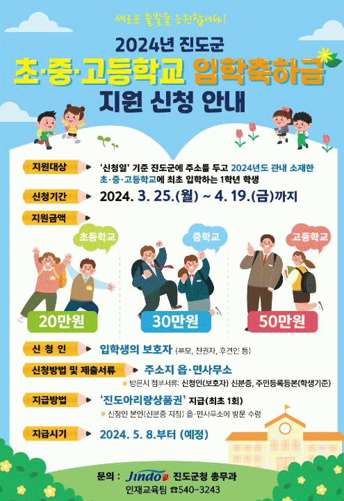진도군 관계자는 “입학축하금은 자녀 교육비 부담을 줄이고 학교 교육의 보편적 교육복지 실현을 위해 실시한다”며 “앞으로도 아이낳고 키우기 좋은 교육환경 조성과 진도의 미래인 인재육성을 위해 다양한 시책을 추진해 나가겠다”고 말했다.
