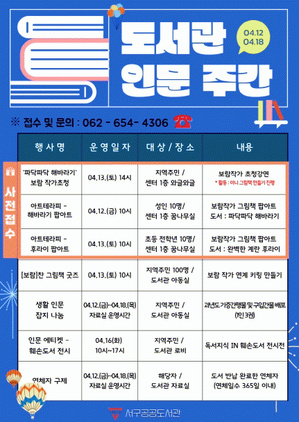프로그램 신청은 서구통합도서관 누리집을 통해 선착순 접수 중이며, 기타 자세한 사항은 상록도서관, 어린이생태학습도서관, 서빛마루도서관, 서구공공도서관으로 문의하면 된다.