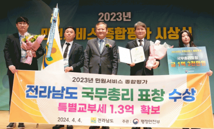 전남도는 4일 정부서울청사에서 열린 ‘2023년 민원서비스 종합평가 시상식’에서 국무총리 기관표창과 함께 포상금으로 특별교부세 1억 3천만 원을 확보했다.