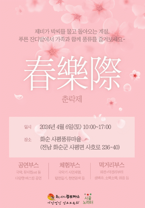 화순 사평풍류마을은 다음달 6일 오전 10시부터 오후 5시까지 화순군 사평면 사호로 236-40 일원에서 마을 봄축제인 ‘삼짇날 풍류즐기기-춘락제’를 진행한다고 밝혔다.