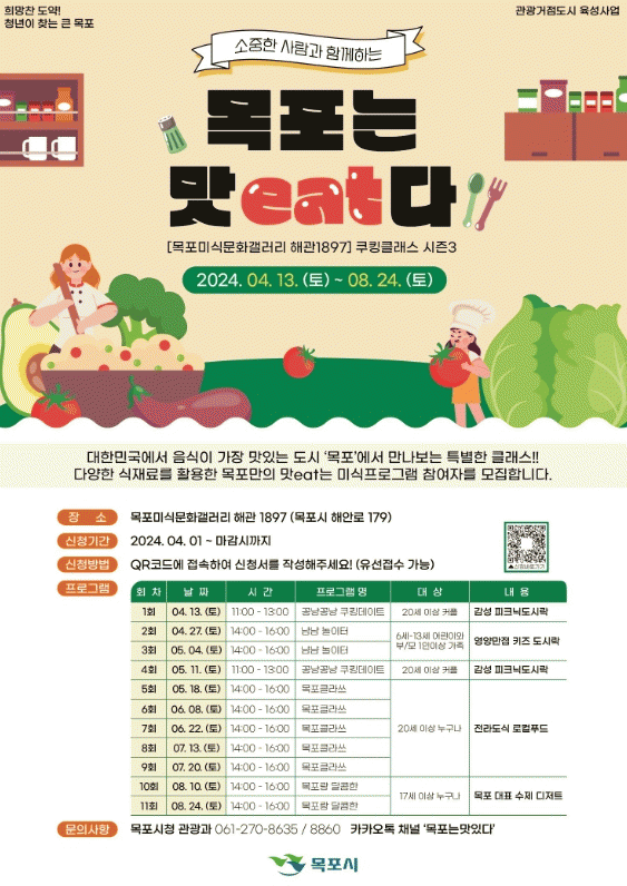 매회 20명을 모집하며, 첫 번째 프로그램은 커플 클래스로. 오는 13일 진행된다. 관심있는 경우 목포시청 누리집과 사회관계망서비스(SNS - 인스타그램, 링크트리, 카카오톡)에서 ‘목포는 맛있다’ 계정을 통해 신청 가능하다.