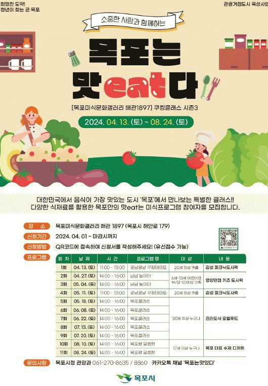시 관계자는 “이번 쿠킹클래스 프로그램이 커플, 가족 등 다양한 계층의 시민과 관광객에게 뜻깊은 시간이 되길 바란다”면서 “쿠킹클래스를 시작으로 목포의 미식 문화를 알리는 특색 있는 프로그램을 운영하고 국제남도음식문화큰잔치와 남도국제미식산업박람회를 성공적으로 개최해 맛의 수도 브랜드화에 속도를 내겠다”고 밝혔다.