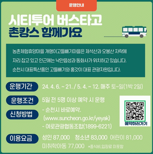 순천시티투어 이용요금, 운행코스 등 상세 내용 확인과 온라인 예약은 순천시 바로예약에서 가능하다.