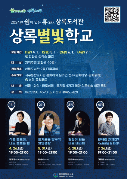 이어 5월~7월까지 슬기로운 방구석 와인생활(임승수 작가), 힐링이 되는 타로 테라피(김리아 타로분석가), 한여름밤 뮤지컬산책‘노트르담 드 파리’(이동섭 예술인문학자)가 운영된다.