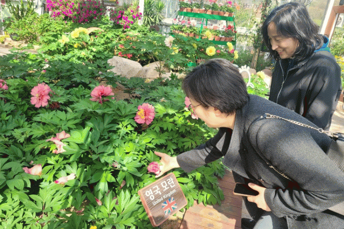 4월 8일 현재, 노란색, 살구색, 자주색 등 미국, 영국 모란 20여 그루가 평소 보기 힘든 형형색색의 화려한 자태를 뽐내며 유리온실을 환히 밝히고 있다.
