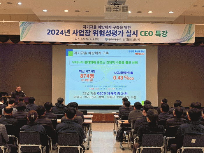 공사 조익문 사장은 이날 강의를 통해 각 부서장 및 팀장, 현장 관리감독 담당자들을 대상으로 자기규율 예방 체계 구축 개요, 중대재해 예방을 위한 현장 안전 관리의 중요성 등을 강조하고 철저한 현장 안전 수칙 준수 및 위험성 감소 대책 발굴 등을 당부했다.