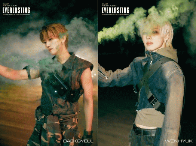 백결과 원혁은 밀리터리 콘셉트 착장으로 남자다운 매력을 제대로 발산했다. 앞서 공개된 예준, 라노와 마찬가지로 두 멤버 역시 연기 속 몽환적인 분위기를 연출하고 있어 팬들의 시선을 모았다.