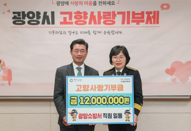 앞서 광양소방서는 지난해 12월 직원 72명이 고향사랑기부에 참여해 기부금 720만원을 기탁한 바 있으며, 올해는 더 많은 직원이 동참해 2년 연속 고향사랑기부금을 기탁했다.