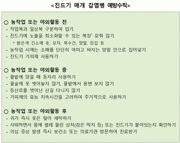 또 치명률이 12∼47% 정도(2013∼2022년 국내 누적 치명률 18.7%)로 높고, 예방 백신과 치료제가 없으므로 물리지 않는 것이 최선의 예방법이다. 야외 농작업이 많은 농업인뿐 아니라 주말농장이나 등산하는 일반인도 감염되지 않도록 주의가 필요하다.