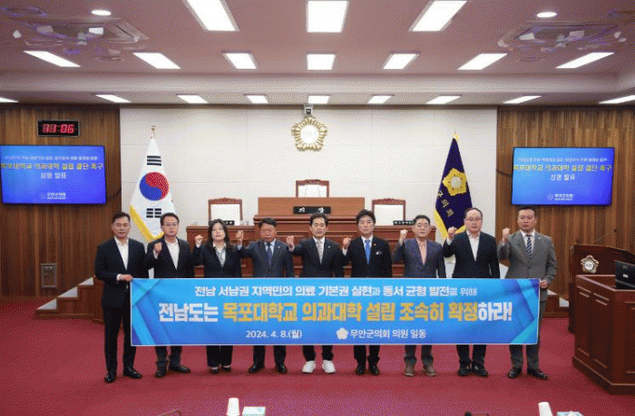 끝으로 군의회는 “‘동서 균형 발전’이라는 허울로 계속해서 무안군민을 비롯한 서부권 지역민을 기만하는 전남도의 행태를 더 이상 좌시하지 않을 것”이라며, “목포대학교 의과대학 설립이 실현될 때까지 지역민과 함께 끝까지 투쟁해 나갈 것임을 천명한다”고 밝히고 성명을 마쳤다.