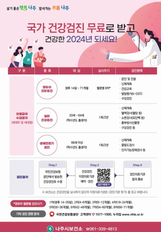 강동렬 나주시보건소장은 “시민의 건강한 일상과 의료급여수급권자 수검률 향상을 위한 SNS와 문자, 우편 발송 등 건강검진 홍보에 힘쓰겠다”고 말했다.