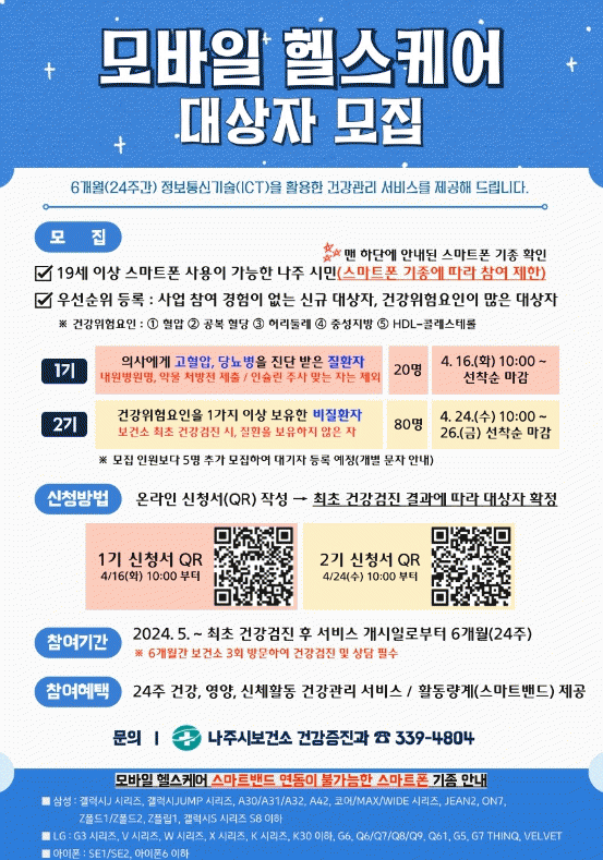 나주시 관계자는 “정보통신기술(ICT)를 활용한 모바일 기반의 건강관리를 적용하여 수혜자 중심의 건강관리사업으로 확대하고, 자가 건강관리 능력을 통한 지역주민의 건강수준 향상을 도모하고자 힘쓰겠다”고 밝혔다.