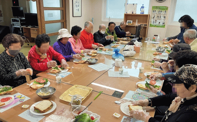 어르신 건강 식생활 교육은 노년기 올바른 식생활 지침 5가지를 소개하는 영양 교육과 다양한 식품군을 활용한 샌드위치 만들기 요리 교육이다.