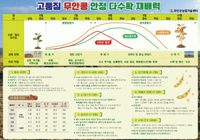 또한 최근 새롭게 보급되고 있는 정부 보급종을 포함한 콩 품종의 특성 등도 재배력에 표기하여 콩 재배 농가가 재배할 품종을 선택할 때 참고할 수 있게 했다.