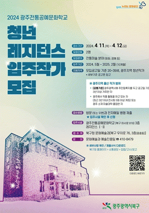 광주전통공예문화학교 레지던스 공간은 주민들에게 창작.전시 공간을 제공하여 지역 예술 활성화를 도모하고자 북구가 지난해 60여 평 규모로 신규 조성한 곳이며 이번 청년 작가 모집은 지역 청년 창작활동과 상호 교류를 지원하고자 마련됐다.