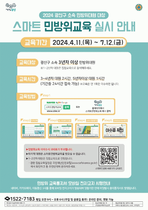 광산구 담당자는 “대원들의 연차에 따라 집합교육과 사이버교육이 병행하는 체계가 정립된 만큼 민방위 대원들의 역량 강화와 실효성 확보를 위해 적극적인 교육 참여를 당부드린다”고 말했다.