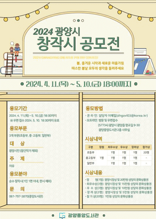창작시 공모전 관련 자세한 사항은 광양시립도서관 누리집 또는 광양중앙도서관으로 문의하면 된다.